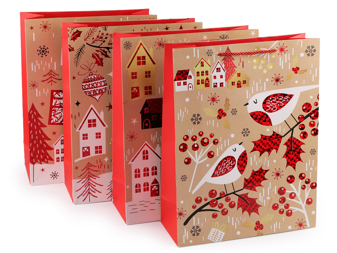 Sada vánočních dárkových tašek je ideální pro balení větších předmětů, ať už jde o hračky, oblečení nebo různé dekorace. Ušetří vám spoustu času při balení. Jsou vyrobené z kvalitního pevného křídového papíru. Přední strana je ozdobená potiskem s metalickými detaily, zadní strana má barevný potisk, boky jsou jednobarevné. Ucha tašky jsou z kroucené saténové šňůry.