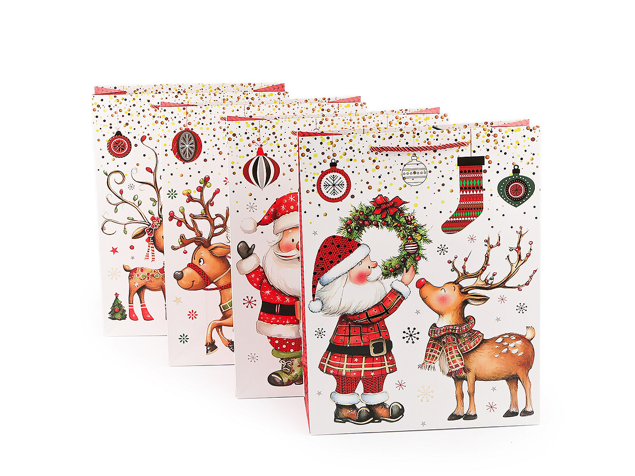 Sada vánočních dárkových tašek Santa se sobem je ideální pro balení větších předmětů, ať už jde o hračky, oblečení nebo různé dekorace. Ušetří vám spoustu času při balení. Jsou vyrobené z kvalitního pevného křídového papíru. Přední strana je ozdobená potiskem se zlatými metalickými detaily, zadní... przeczytaj całość