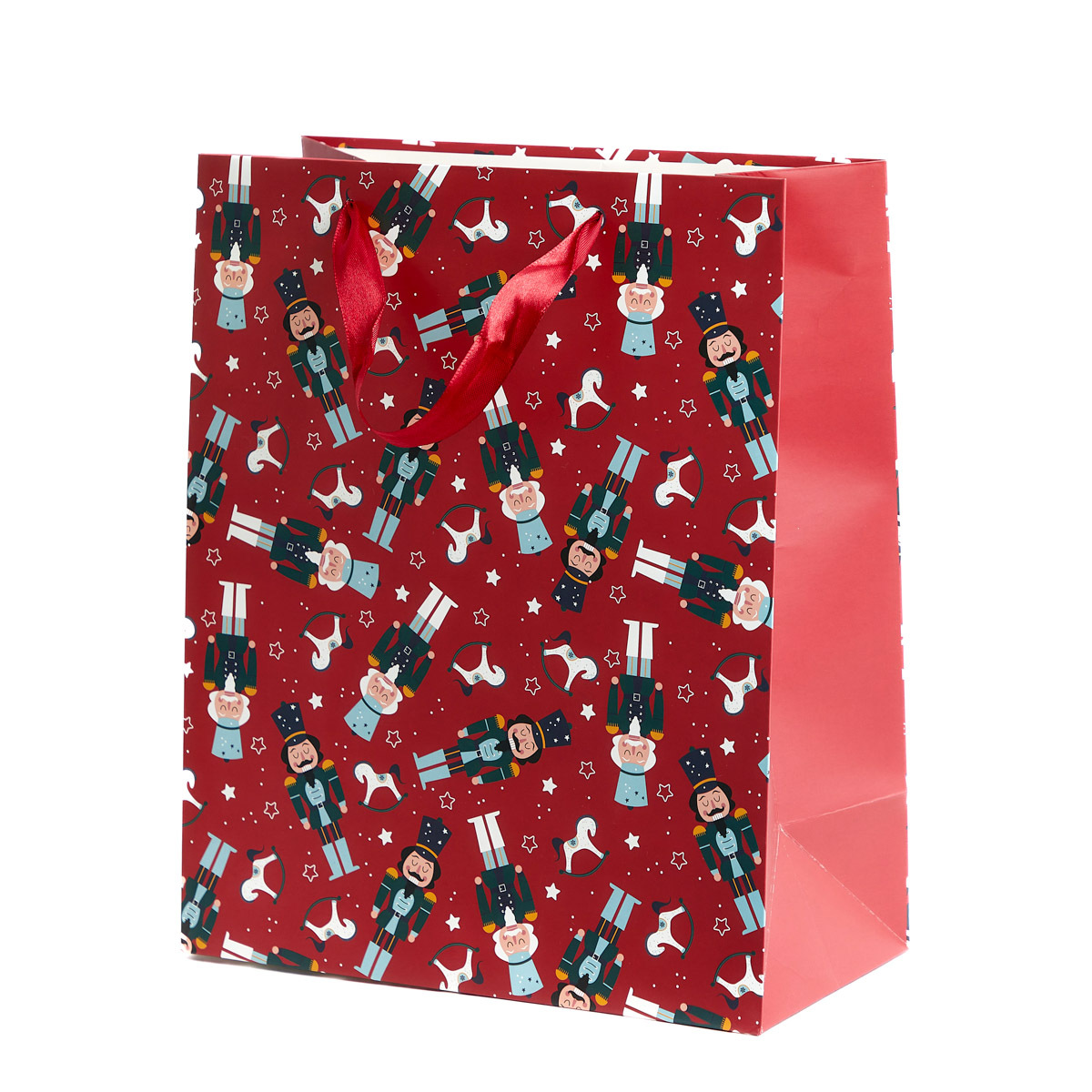 Malá červená dárková taštička s motivem louskáčku a houpacího koníka - Odolná dárková taška - Krásný, slavnostní vzorDárková taška CYMKA je červená. Zdobí ho slavnostní vzor s louskáčky, houpacími koníky a hvězdami. Postavy louskáčků se liší barvou vlasů a klobouků. Je to roztomilé a perfektní...