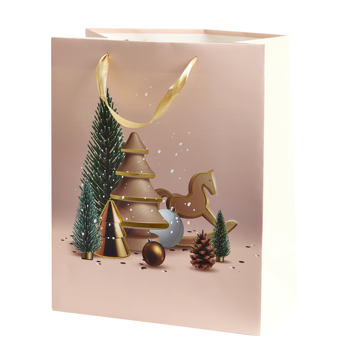 Malá béžová dárková taštička s vánočními ozdobami - Odolná dárková taška - Krásný, slavnostní vzorDárková taška CYMKA má jemnou, béžovou barvu. Zdobí jej grafika znázorňující kompozici, která se skládá z několika vánočních ozdob, včetně vánočních stromků, cetek a houpacího koně. Prvky na béžové...