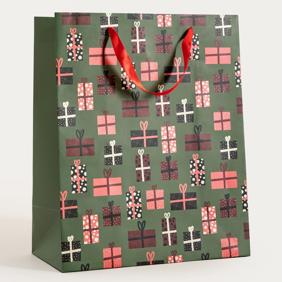 Vánoční dárkový design - Ideální volba pro balení dárků - Dárková taška zelená 14 × 27 × 33 cmHledáte originální způsob, jak zabalit dárek? Taška CYMKA o rozměrech 14 × 27 × 33 cm je praktickým a elegantním řešením. Zelené pozadí zdobené motivem dárků perfektně ladí se sváteční atmosférou a...