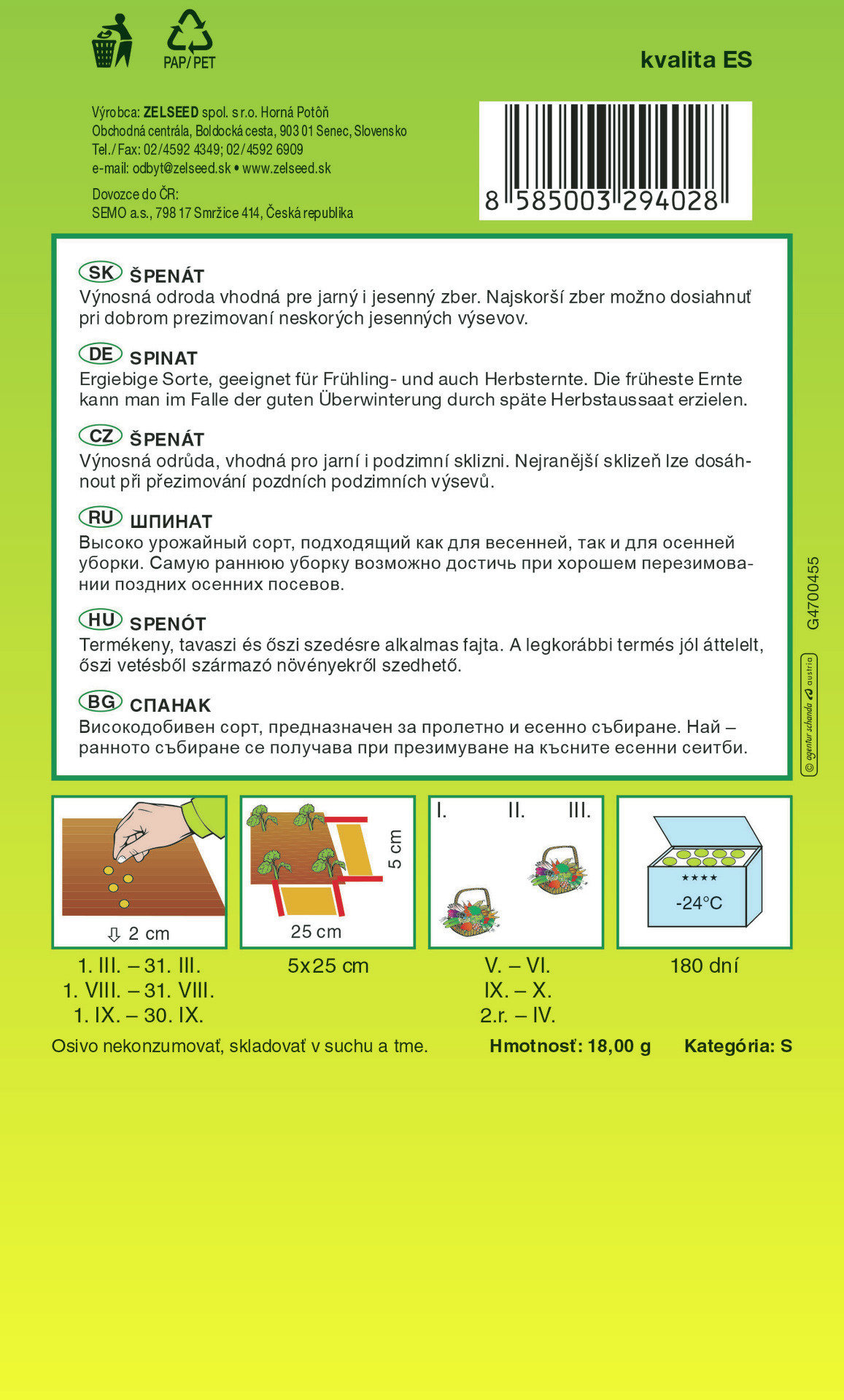 Spinacia oleracea L. / ŠpenátPopis:Nejvhodnější pro pěstování jsou hlinitopísčité, dostatečně vododržné půdy s pH 6 – 7,5. Nesnáší suché a kyselé půdy a větrné polohy. Jarní kulturu z březnových výsevů sklízíme 5 – 6 týdnů po výsevu. Jako následnou plodinu ze srpnových výsevů sklízíme v září až v...