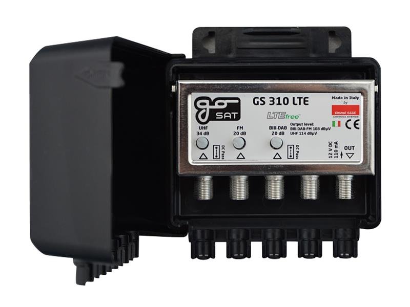 GoSAT GS310 LTE to trójwejściowy wzmacniacz masztowy produkowany w technologii SMT w nowym ulepszonym wzornictwie, o zwiększonej odporności na warunki atmosferyczne oraz podwyższonej odporności na sprzężenia. Wzmacniacz zaprojektowano tak, aby spełniał wszystkie wymagania dotyczące odbioru cyfrowego sygnału telewizyjnego zgodnie z obowiązującymi dyrektywami CE. Wzmacniacz nadaje się do montażu zarówno wewnątrz, jak i na zewnątrz. Pojedyncze wejścia VKVII, DAB i UHF mają niezależną regulację wzmocnienia za pomocą rezystancyjnych trimrów; zasilanie wzmacniacza +12V realizowane jest zdalnie po kablu koncentrycznym przez wyjście, na wejściach DAB i UHF można włączyć zasilanie przedwzmacniaczy +12V za pomocą zworki (jumperów). Wzmacniacz charakteryzuje się dobrą liniowością w całym wzmacnianym paśmie oraz doskonałym stosunkiem sygnału do szumu. Dobre poziomy wyjściowe gwarantują wysoką jakość dystrybucji sygnału. Plastikowa obudowa wzmacniacza zapewnia zwiększoną ochronę przed warunkami pogodowymi i jest przystosowana zarówno do montażu na maszcie (maks. średnica ok. 55 mm przy użyciu uchwytu FeZn z gwintami M4), jak i do montażu na ścianie; wejścia i wyjścia są na złącza F.
