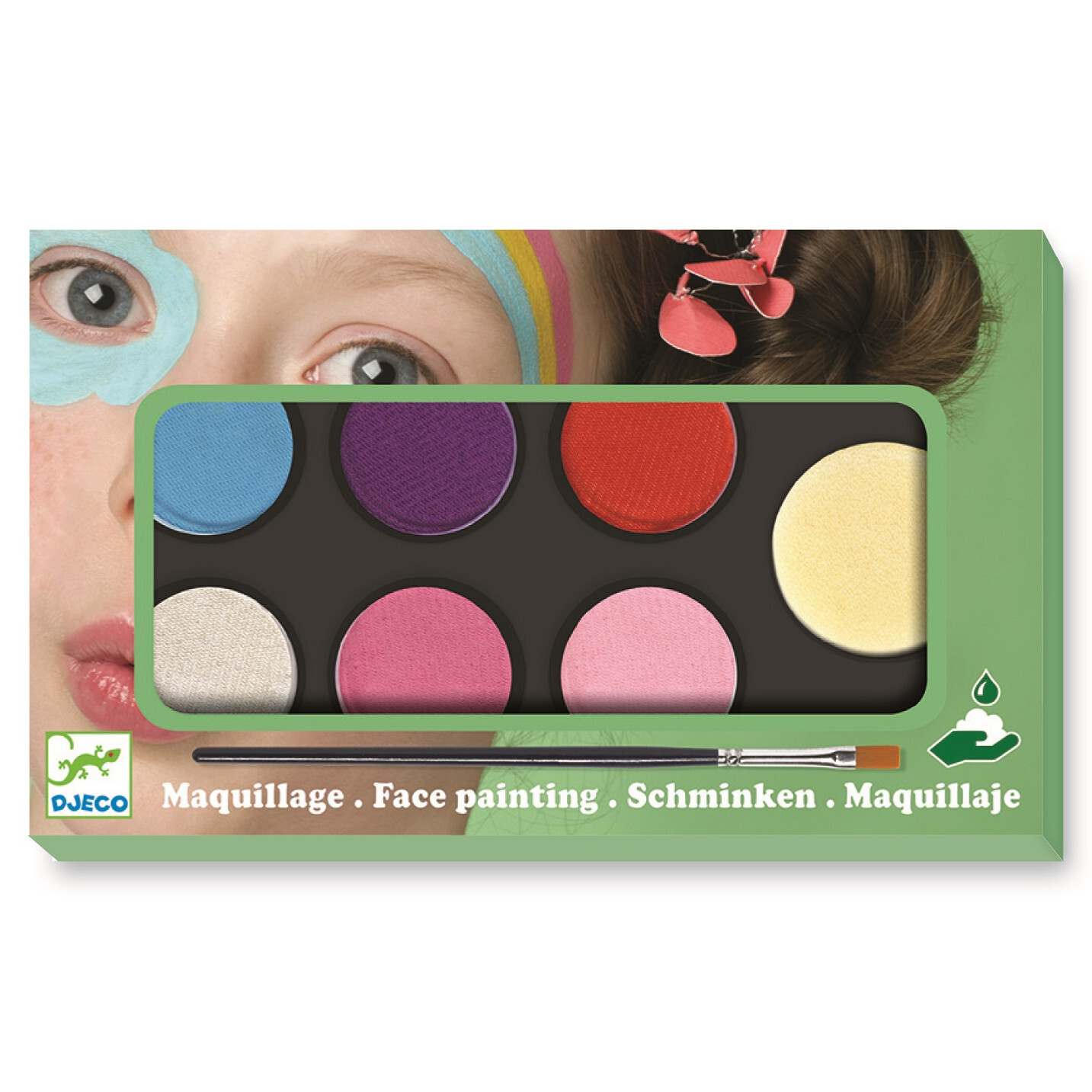 DJECO Farby do malowania twarzy - słodkie odcienie to idealny sposób, by pobudzić dziecięcą wyobraźnię i dodać radości twarzy. Dzięki sześciu delikatnym pastelowym odcieniom możesz w prosty i szybki sposób stworzyć wesoły i oryginalny makijaż.