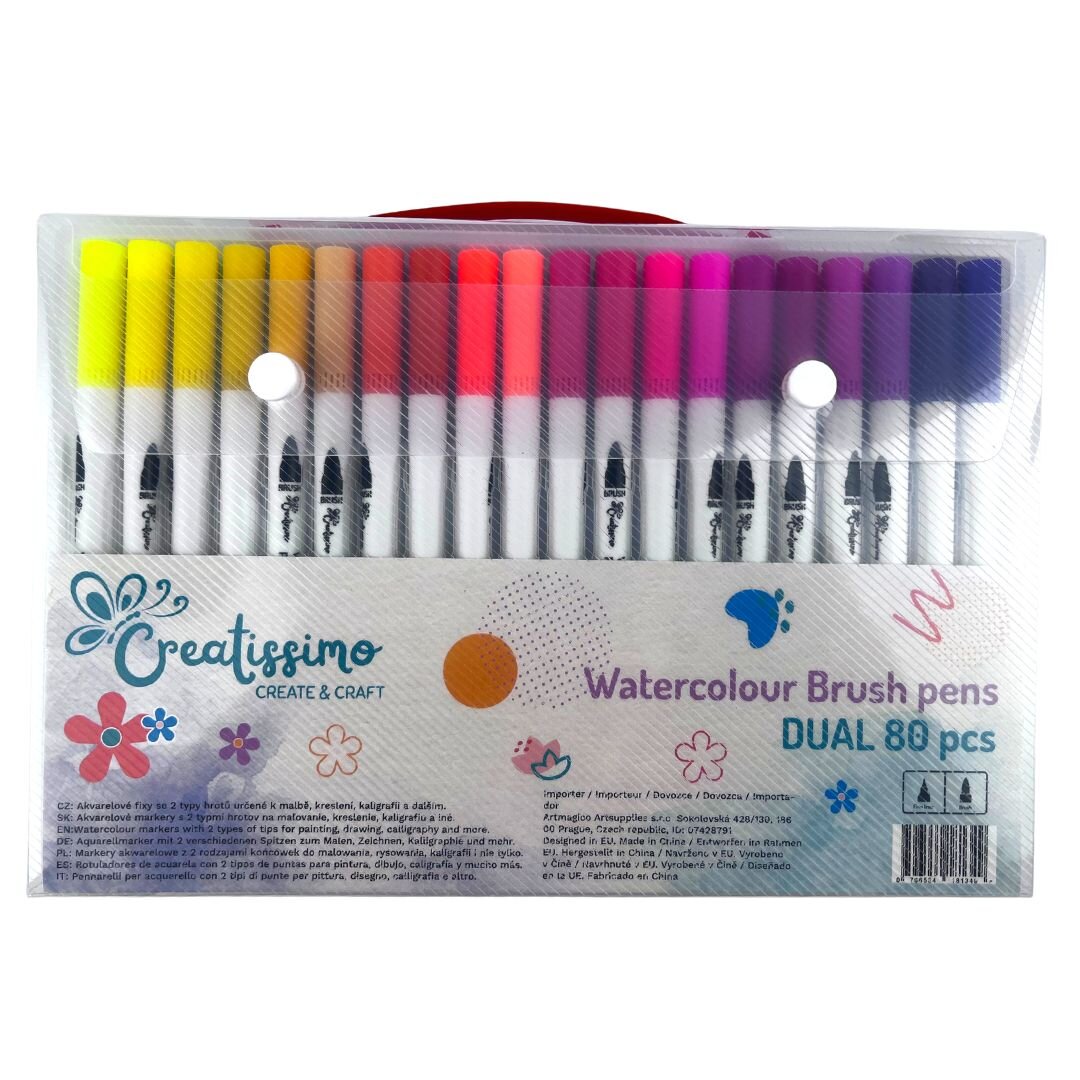 Zestaw flamastrów zawiera 80 sztuk błyszczących i intensywnych flamastrów akwarelowych. Flamastry mają dwie końcówki - cienki liner oraz pędzelkową (brush pen). Połączenie końcówki pędzelkowej i linera dla maksymalnej kreatywności. Idealne do delikatnych linii, detali i szerokich pociągnięć. Odkryj radość rysowania i malowania w jednym narzędziu! Są idealne do rysunku, kolorowanek czy nowoczesnej kaligrafii.