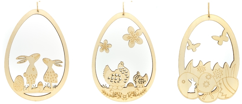 Drewniane jajka do powieszenia, . wys. 25 cm, grubość: 4,5 mm. Op. zawiera 1 szt. ze sznureczkiem o dł. 50 cm. . Dostępne 3 wzory. sp. pakowania 1/12/120 szt. przeczytaj całość