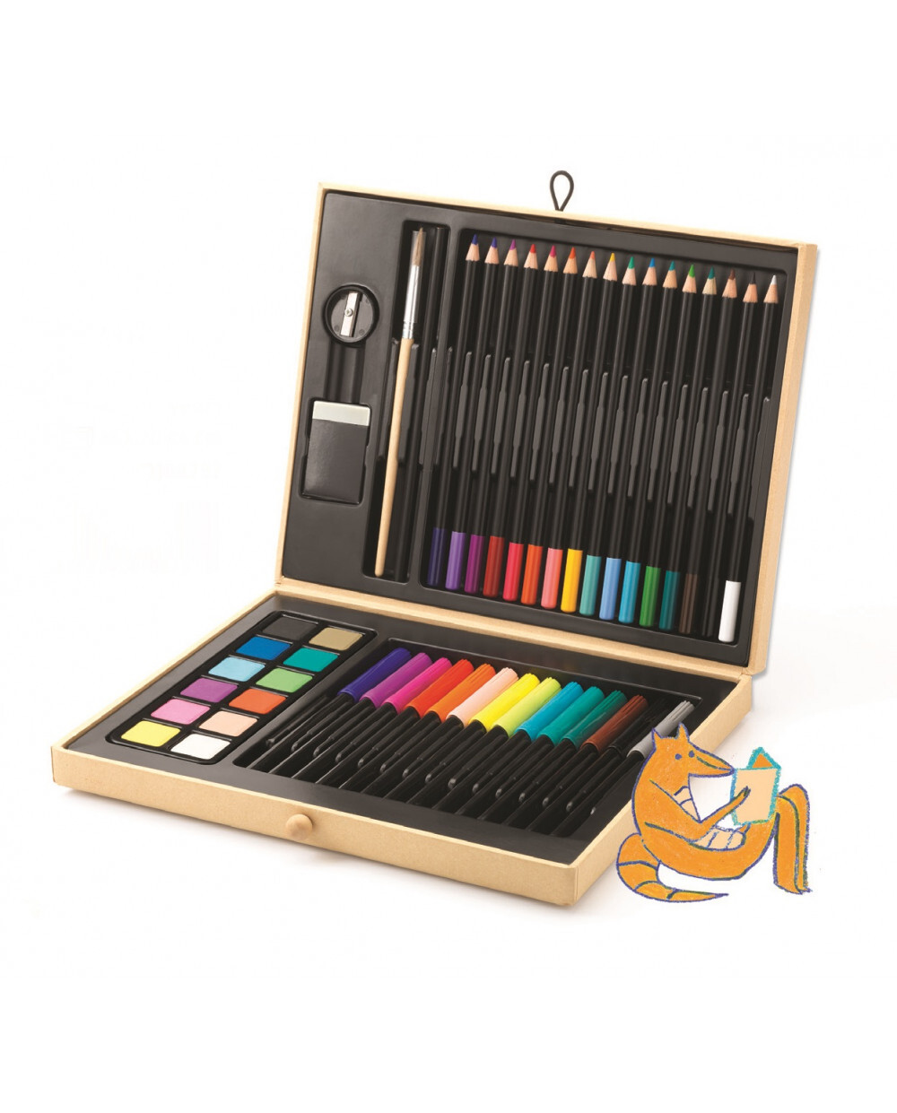 Ten duży artystyczny kuferek jest idealny do tworzenia i jest pełen przyborów plastycznych. Kuferek zawiera 15 flamastrów, 16 kredek, 12 farb wodnych, pędzelek, temperówkę i gumkę, wszystko w praktycznych przegródkach, aby nic się nie zgubiło.