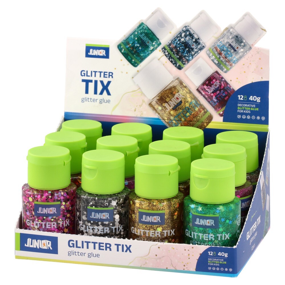 Klej Glitter Tix z brokatem w intensywnych i atrakcyjnych kolorach. W tubce PVC z aplikatorem dla precyzyjnej i łatwej aplikacji.