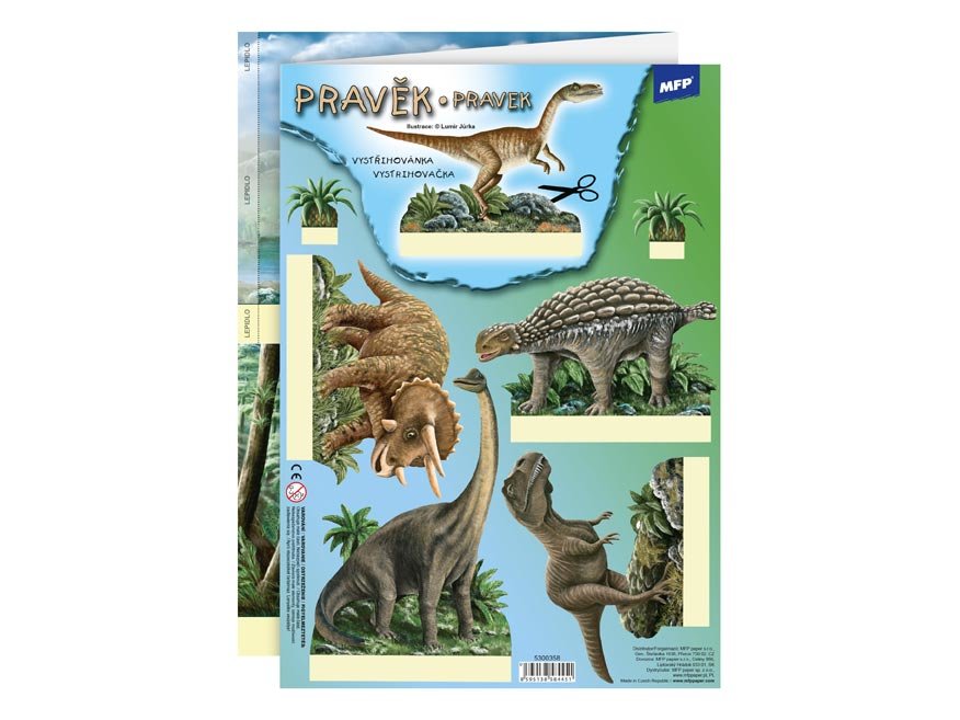 Vystřihovánky Pravěk. Zažijte spoustu zábavy s vystřihovánkou pro děti s tématikou dinosaurů a pravěku. Vystřihovánky MFP Pravěk jsou na 3 listech formátu A4. Vystřihovánka se skládá z pozadí a 11 dinosaurů.NÁVOD: Na označená místa použijte lepidlo a nůžky. Přerušované čáry znamenají záhyb.Papír:...
