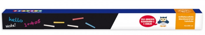 Czarna samoprzylepna folia tablicowa o wymiarach 45 cm x 2 m. Opakowanie zawiera folię i 5 kred w różnych kolorach (2x biała, czerwona, niebieska i żółta). przeczytaj całość