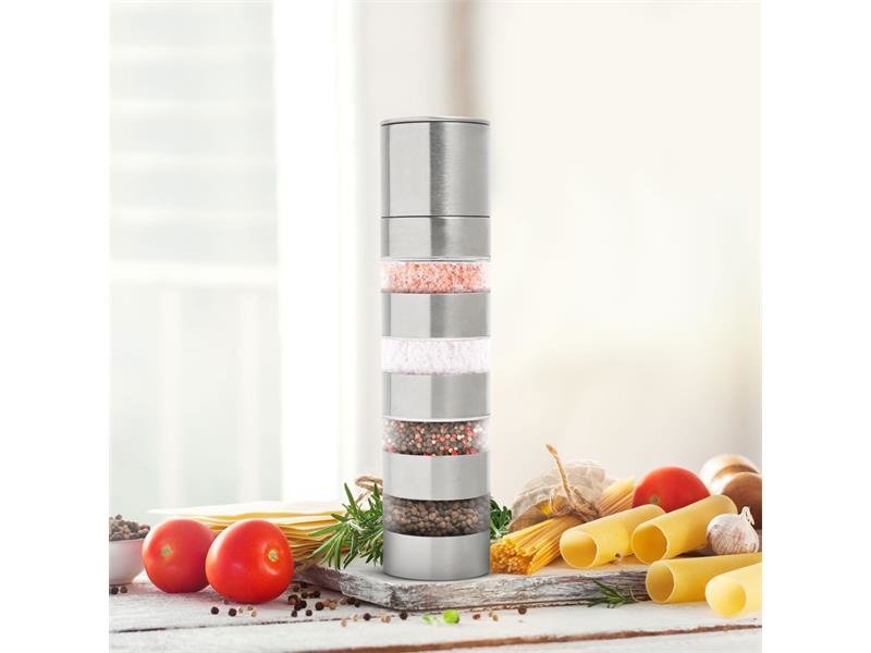 Mlýnek na pepř vyrobený z nerezavějící oceli, který disponuje čtyřmi úložnými přihrádkami, jejichž pořadí je volitelné, díky čemuž budete mít vždy po ruce to koření, které právě potřebujete. Jemnost mletí můžete nastavit pomocí otáčedla, v závislosti na tom kolik koření právě potřebujete.