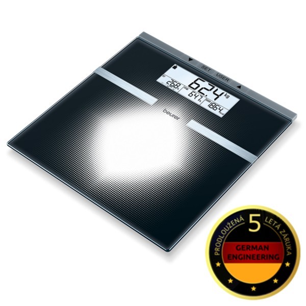 osobní a diagnostická váha speciální designový efekt hmotnost, tuk, svaly, voda, kostispotřeba kalorii (AMR, BMR)výpočet BMIelektrody z nerezové oceli velký LCD s více diplejičíslice 25mm (hmotnost)10 uživatelských pamětí5 úrovní aktivityautomatické vypínáníaktivace našlápnutímindikace...