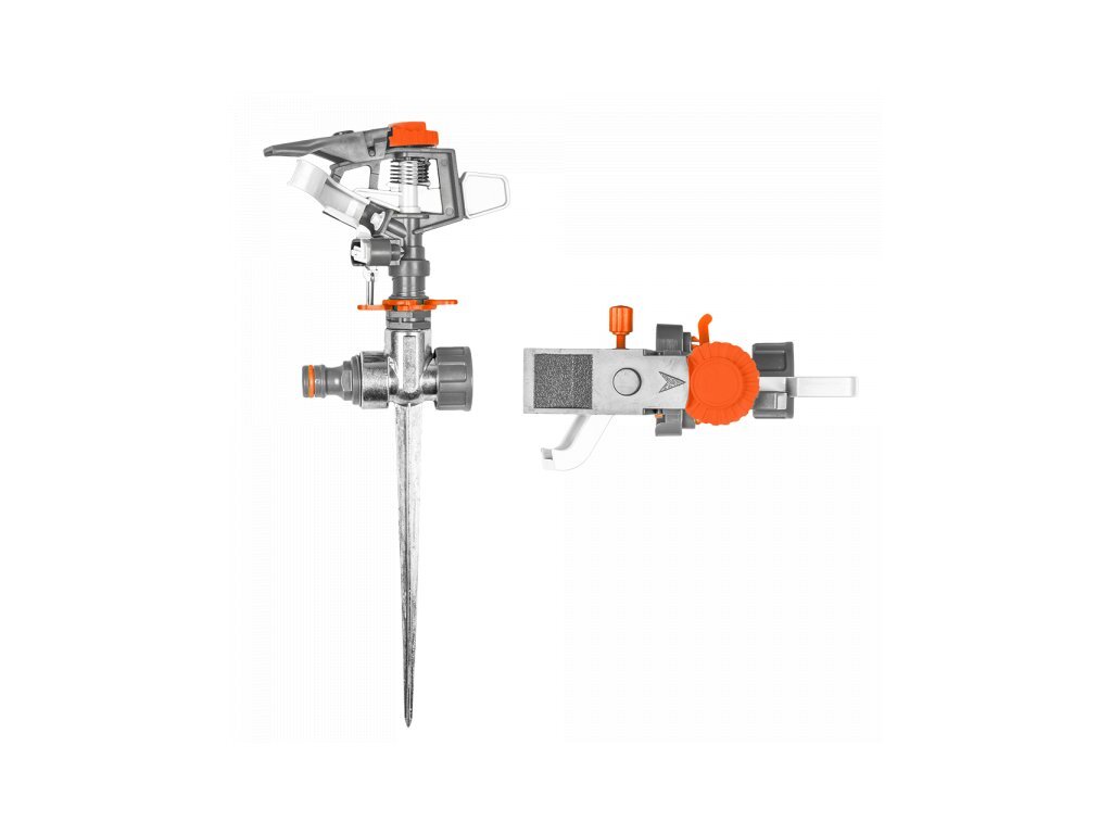 Pulzní zavlažovač na průchozím kovovém trnu z vysoce kvalitního plastu. Nastavitelná velikost a tvar zavlažované plochy. Uzamčení pro postřik vybraného sektoru. Trn má vsuvku pro rychlospojky a možnost sériového spojení s dalšími zavlažovači. Maximální průměr zavlažovací plochy 18 m (cca 250 m²).