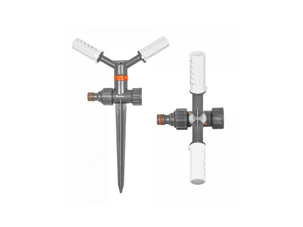 Dvouramenný rotační zavlažovač na plastovém trnu. Obě postřikovací ramena jsou nastavitelné, což umožňuje upravit plochu postřikovače. Lze zapojit do série s dalšími zavlažovači.