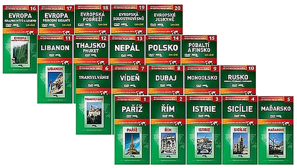 Sada obsahuje sérii 20 filmů, pořadová čísla filmů 1 až 20 Paříž, Řím, Istrie, Sicílie, Maďarsko, Transylvánie, Vídeň, Dubaj, Mongolsko, Rusko, Libanon, Thajsko – Phuket, Nepál, Polsko, Pobaltí a Finsko, Evropa – krajina mýtů a legend, Evropští přírodní giganti, Evropská pobřeží, Evropská... przeczytaj całość