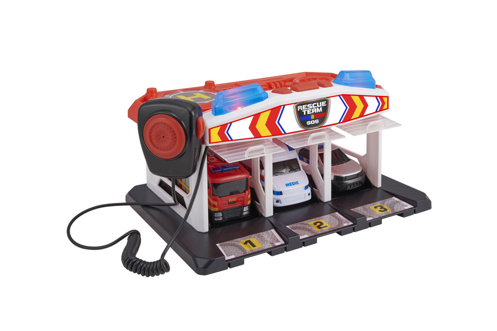 Teamsterz výjezdní jednotka, Teamsterz výjezdní jednotka obsahuje3 garážová stání, 3 automobily- záchranářský vůz, hasičský vůz apolicejní vůz. Sada také obsahuje vysílačku. Výrobek je vhodný pro dětido 3 let. Výrobek vyžaduje 3× AAA baterie, které jsou součástíbalení. przeczytaj całość