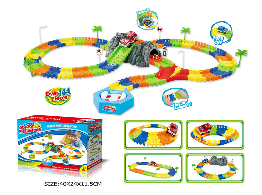 Zmienny tor z tunelem, który składa się z 144 części. W zestawie znajduje się jedno autko, tunel i inne akcesoria. Zestaw jest zasilany bateriami 2×1,5V AA - baterie nie są dołączone. W ofercie dostępne jest autko w kolorze czerwonym lub niebieskim. Tor jest bardzo prosty w montażu. przeczytaj całość