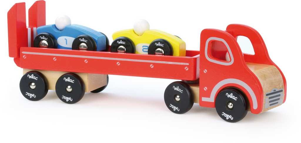 Dvě závodní auta jsou připravena vyjet z přepravního kamionu! Tento dřevěný návěs má v zadní části sklopnou rampu. Vytvoří tak nájezd pro auta a může je přepravit kamkoliv potřebují. Vyrobeno z dřevěného masivu s netoxickými barvami, velikost tak akorát pro dětské ruce. Hračky Vilac mají značku...