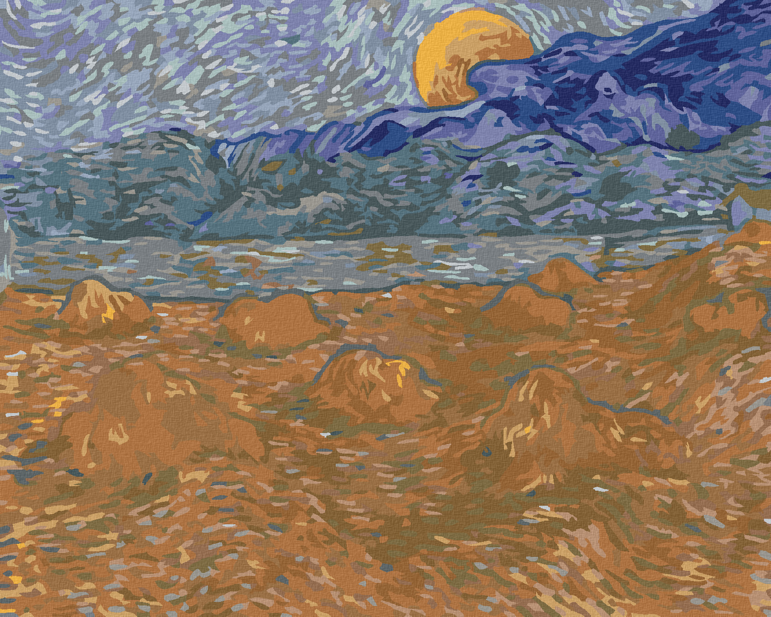 Malování podle čísel - KRAJINA S PŠENIČNÝMI SNOPY A VYCHÁZEJÍCÍM MĚSÍCEM (VINCENT VAN GOGH) - 80x100 cm, vypnuté plátno na rám
