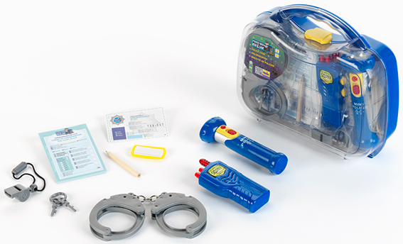 Policejní kufřík s doplňky pravého policisty. Obsahuje baterku, vysílačku, píšťalku, pousta s klíči, jmenovku, průkaz totožnosti a psací blok s tužkou. przeczytaj całość