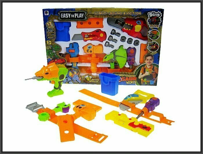 Zestaw 17 plastikowych narzędzi dla małego majsterkowicza.Posiada efekty dźwiękowe i świetlne.Wiele narzędzi zostało stylizowanych na dinozaury. baterie: 4 x AG13 LR44 (w zestawie). Wymiary opakowania: 33,5 x 49,5 x 6,5 cmWiek: 3+ przeczytaj całość