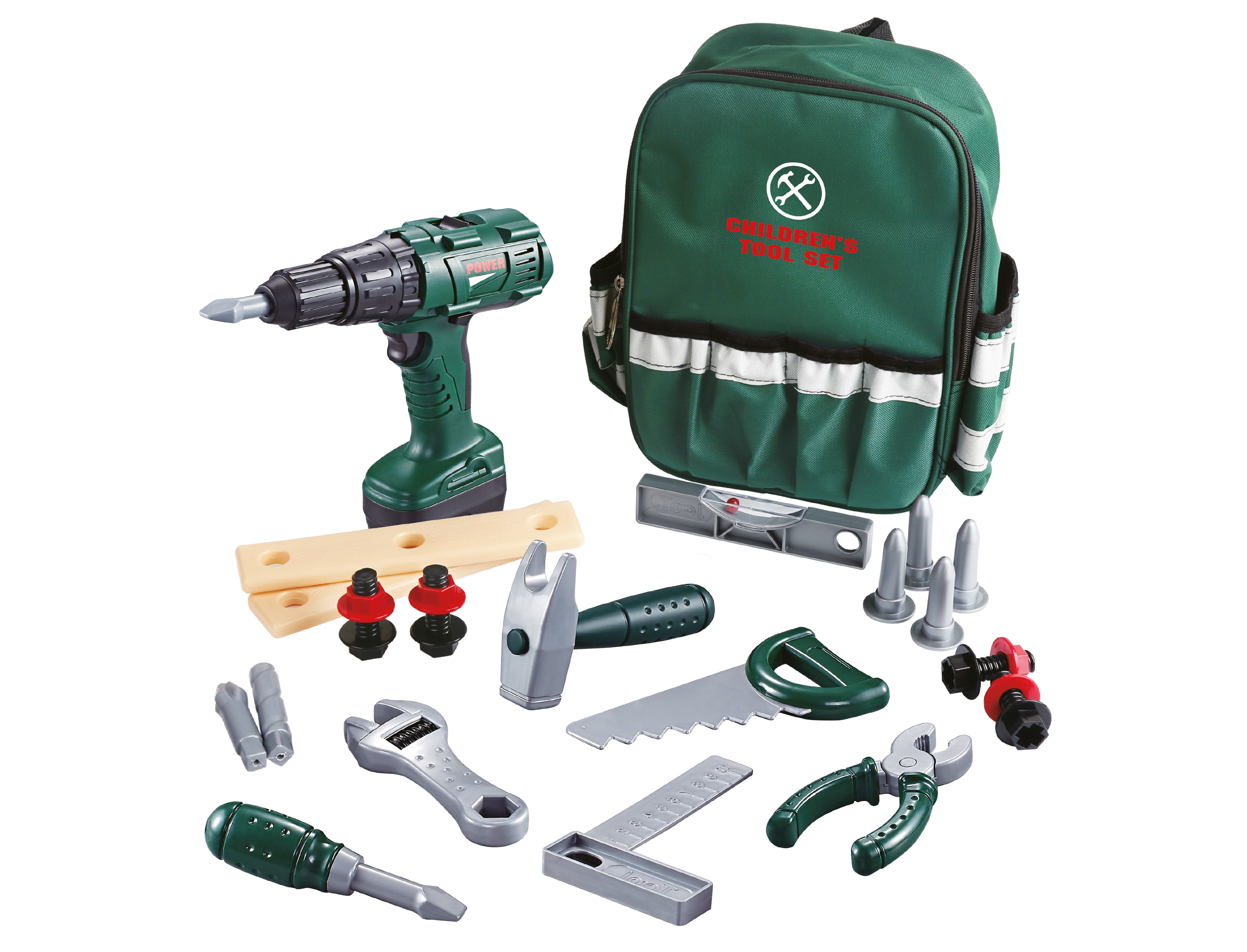 Nářadí v batohu. Součástí batoh a 25 ks nářadí - elektrický šroubovák, klasický šroubovák, pilka, kombinačky, kladívko, metr, vodováha klíč, šrouby, matice a další. 2xAA baterie do elektrického šroubováku nejsou součástí. przeczytaj całość