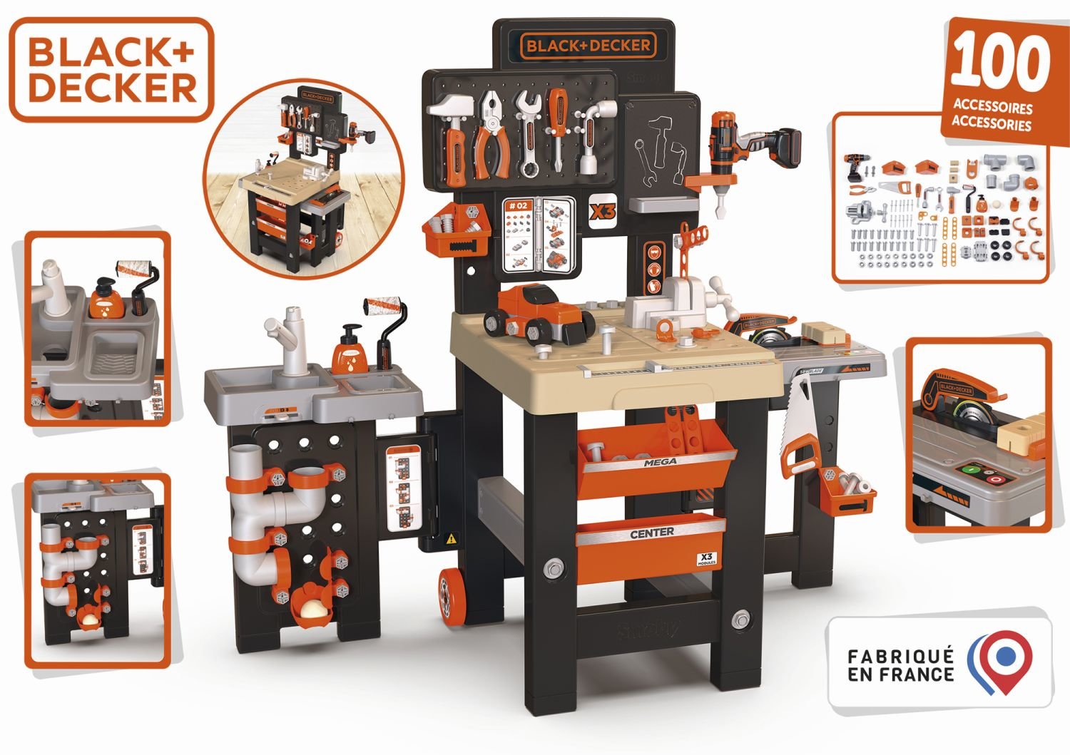 Skládací pracovní dílna Mega Workbench Center Smoby Black+Decker se 3 hracími plochami a se stavebnicí auta. Dílna nabízí nejen klasickou pracovní plochu pro příklep, vrtání a šroubování, ale také doplňkové pracoviště pro malířské a klempířské práce a také plochu pro řezání. Je vybavena...