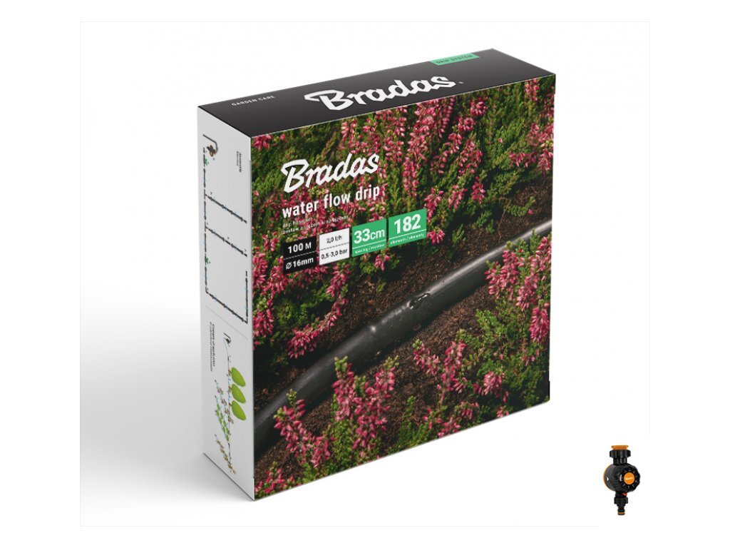 Zavlažovací sada, kapací hadice Water Flow Drip ø16mm 100m, 182ks příslušenství a zavlažovací hodiny BRADAS