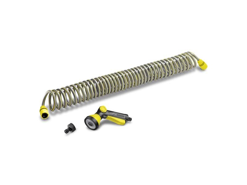 Sada spirálové hadice Kärcher nabízí ideální předpoklady pro pravidelné zavlažování v malých zahradách, na terasách, balkonech nebo při kempování. Již není nutné žádné zdlouhavé a namáhavé nošení zalévacích konví nebo tahání zahradních hadic. Sada spirálové hadice Kärcher je tím pravým pomocníkem a vždy připravena na všechny možné typy zavlažování. Vybavení: 10 m spirálová hadice neobsahující ftaláty, odolná proti UV záření, multifunkční postřikovací pistole, 1x spojka pro spirálovou hadici s ochranou proti zlomení, 1x spojka pro spirálovou hadici s ochranou proti zlomení a Aqua Stopem, kohoutová přípojka G3/4. S pomocí sériově dodávané multifunkční postřikovací pistole lze snadno odstranit i hrubé nečistoty ze zahradního nářadí. Spirálová hadice získá po každém použití zpět svůj kompaktní tvar.