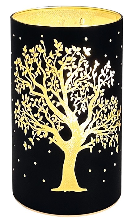 Svítící skleněný válec s motivem stromu – černý, 15 x 9 cm, teplá bílá, 10 LED, časovač