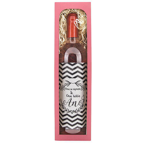 Dárkové růžové víno 0,75 l pro dámy při registrovaném partnerstvíUnikátní kolekce kvalitních dárkových vín - dárkové svatební víno. Krásný dárek u příležitosti registrovaného partnerství pro nevěstu a nevěstu nebo pro svatebčany s textem: Ona se zeptala a Ona řekla ANO.Suchá odrůdová vína z...