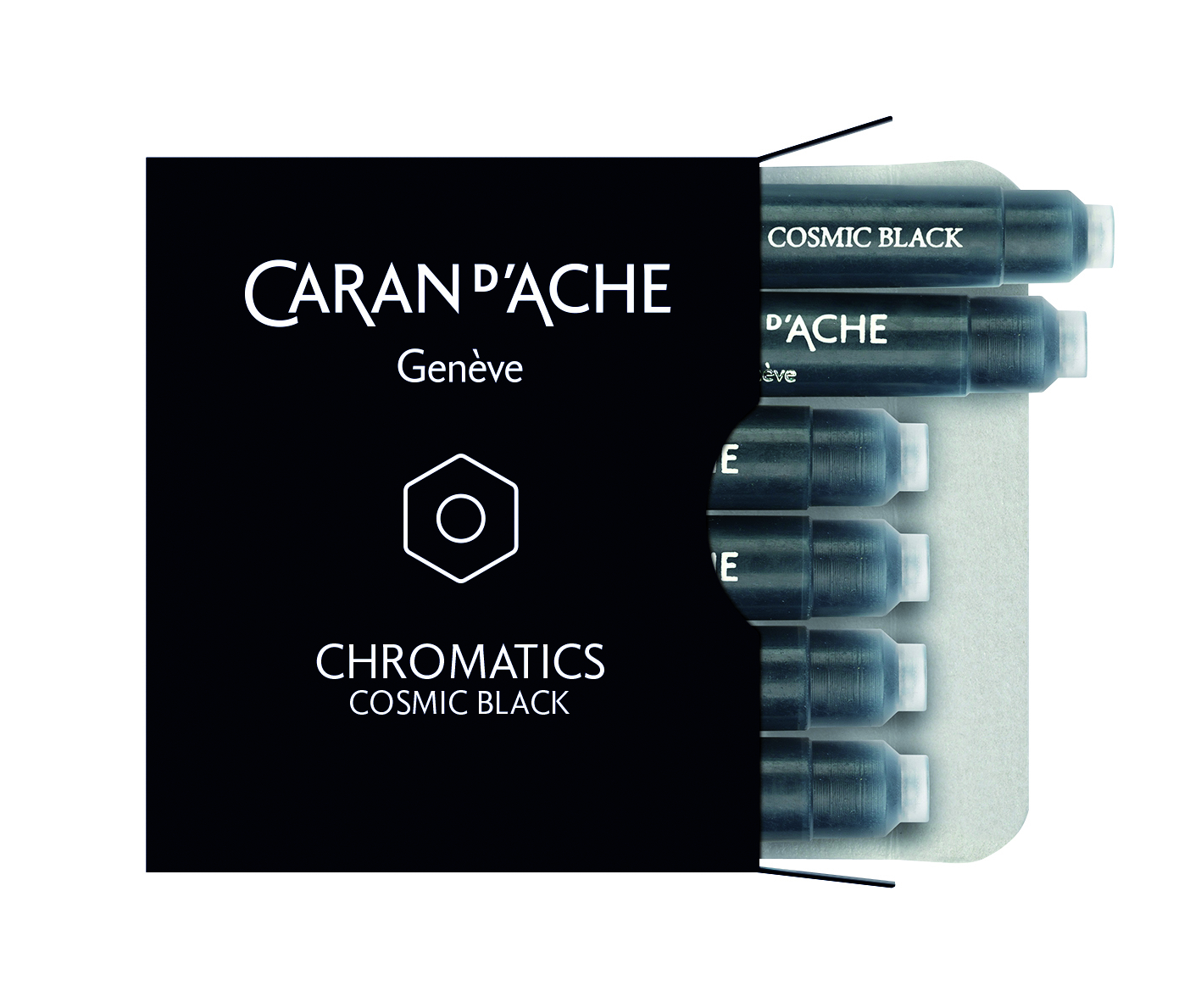 Box of 6 Ink Cartridges Fountain CHROMATICS Cosmic BlackCaran d'Ache, Maison de Haute Ecriture, nabízí nadšencům psaní řadu inkoustů ve výjimečných barvách. Po úspěchu lahviček s inkoustem Chromatics INKredible Colours byla kolekce rozšířena o balení šesti malých kazet v mezinárodním formátu....