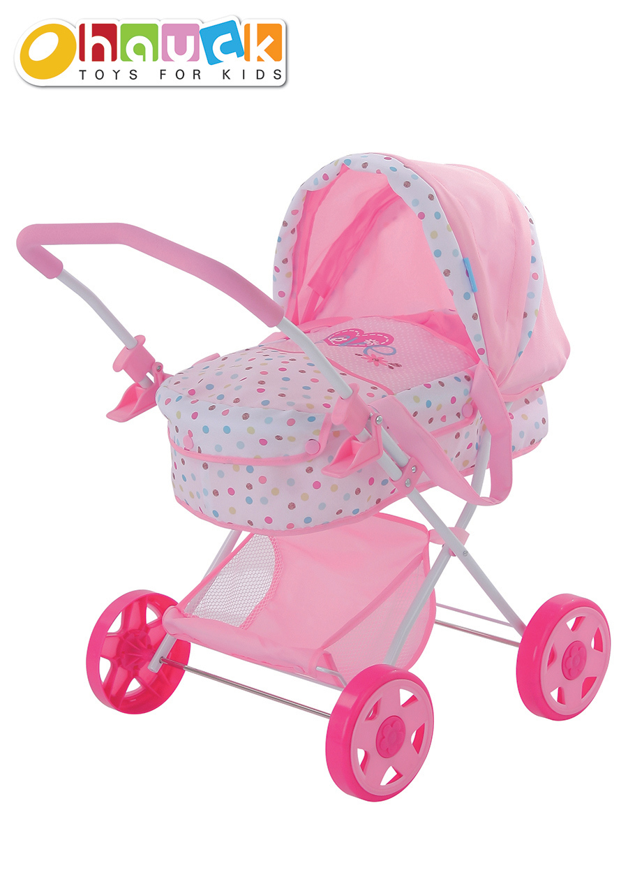 Dětský kočárek pro panenky v růžové barvě se sdríčky. Kočárek váží 1,3kg. Rozměry rozloženého kočárku 62x38x57,5cm. Rozměr vnitřní korbičky 23x46,5cm. Výška madla kočárku je 57,5cm (nepolohovatelné). Průměr koleček 13,5cm. Kočárek má spodní odkládací látkový košík a má stříšku. Součástí kočárku...