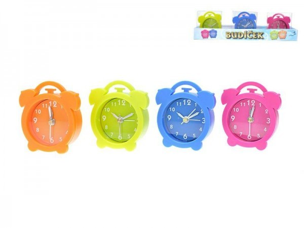 Budík barevný mini 5.3x6x2cm na baterie, 4 barvy, v krabičce - 1 kus