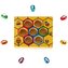 Zawiera 7 pszczółek - każdą w innym kolorze oraz drewnianą planszę/podstawę wykonaną z litego drewna. Na podstawie znajduje się zabawny obrazek z motywem plastra miodu.