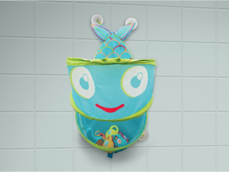 Originální skládací koš na hračky v podobě usměvavé ryby snadno připevníte díky čtyřem přísavkám nad vanu. Síťovinové díly umožňují odtok vody z uložených hraček a jejich vyschnutí.Pokud koš nepoužíváte, je možné jej složit do plochého kompaktního tvaru.Rozměry cca 30x52cm.  przeczytaj całość