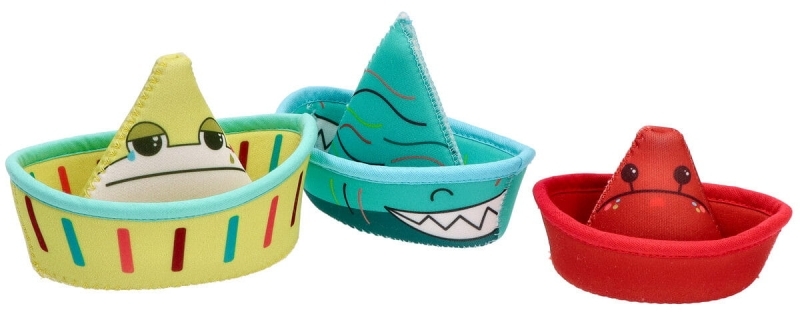 Zestaw zawiera trzy kolorowe łódki z motywami żaby, rekina i kraba, wykonane z szybko schnącego i miękkiego neoprenu, który jest bezpieczny nawet dla najmłodszych. Dzięki lekkiej i tradycyjnej formie papierowych łódek doskonale unoszą się na wodzie i zapewniają nieskończoną zabawę podczas kąpieli.