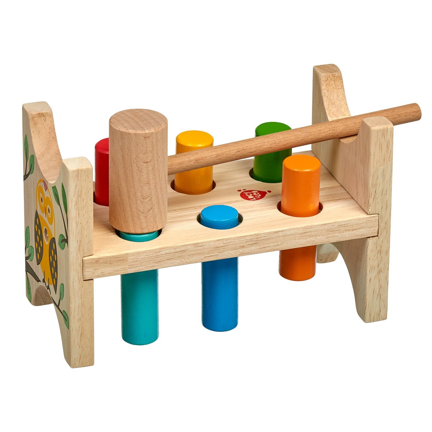 Lesní sova je klasická dřevěná zatloukačka s barevným veselým obrázkem pro kluky i holky. Má dřevěnou desku s šesti otvory a kladívko, které slouží pro nácvik zatloukání 6ti barevných kolíků. Po zatlučení všech kolíků se stojánek otočí a může se začít opět zatloukat. Hračka slouží k rozvoji jemné motoriky, koncentrace a především koordinaci pohybu. Rozměry stojánku 13,8 x 8,5 x 9,3 cm.