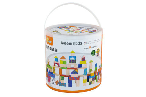 Dřevěná stavebnice v kyblíku. Obsahuje 100 dílků a obrázkovou brožuru s návody na stavění. Rozměry balení cca 22,5 x 22 cm. Velikost kostek 2,5 - 7,5 cm dle druhu. Věk 2+ przeczytaj całość