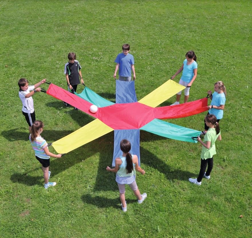 Ten dziecięcy "spadochron" to super zabawa z piłką (piłka nie jest częścią zestawu). Można użyć dowolnej piłki. Na przykład tych. Zależy, jaka waga i rozmiar piłki będą Ci odpowiadać. Dlatego to świetne. Można dowolnie wymieniać piłki.