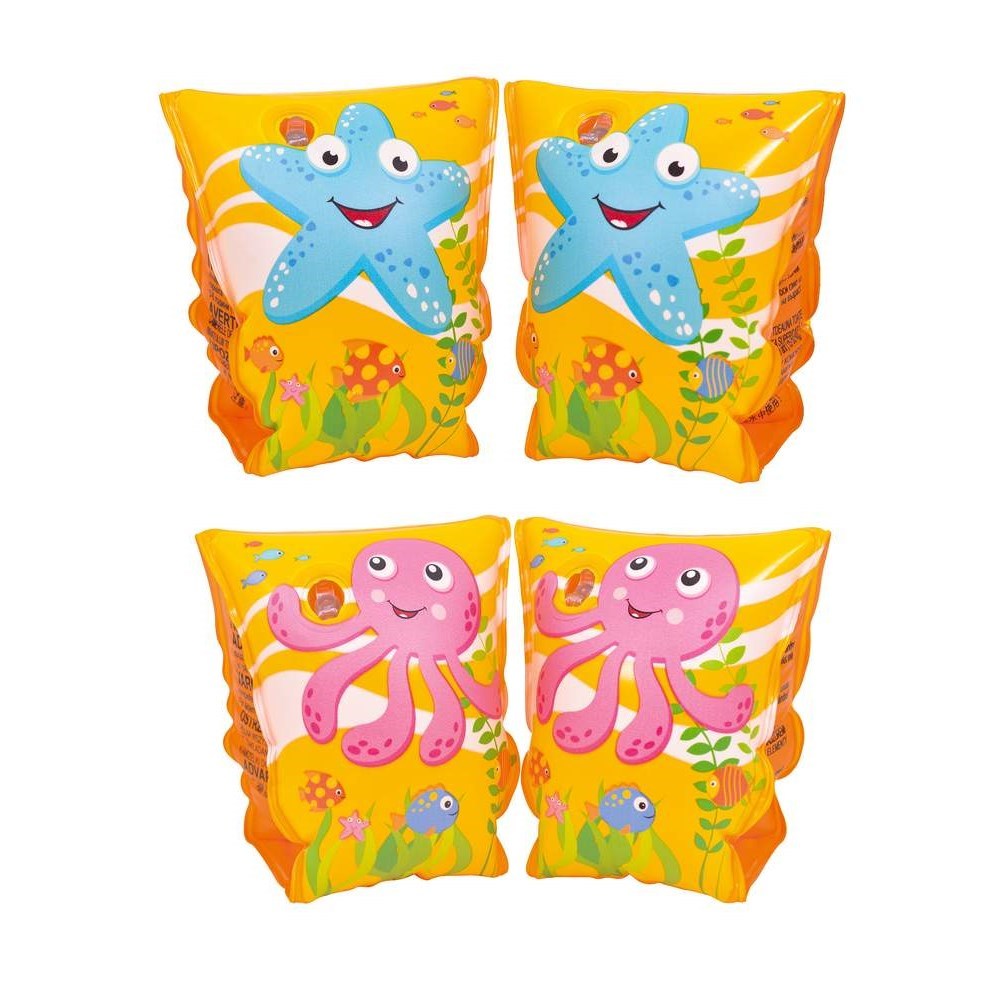 Dmuchane rękawki przeznaczone dla dzieci w wieku 3 - 6 lat są świetną pomocą przy nauce pływania. Wymiary napompowanych rękawków: 16 x 16 x 14 cm, materiał: winyl. Rękawki dostarczane są w 2 wzorach - żółte tło z różową ośmiornicą lub niebieska gwiazda. przeczytaj całość