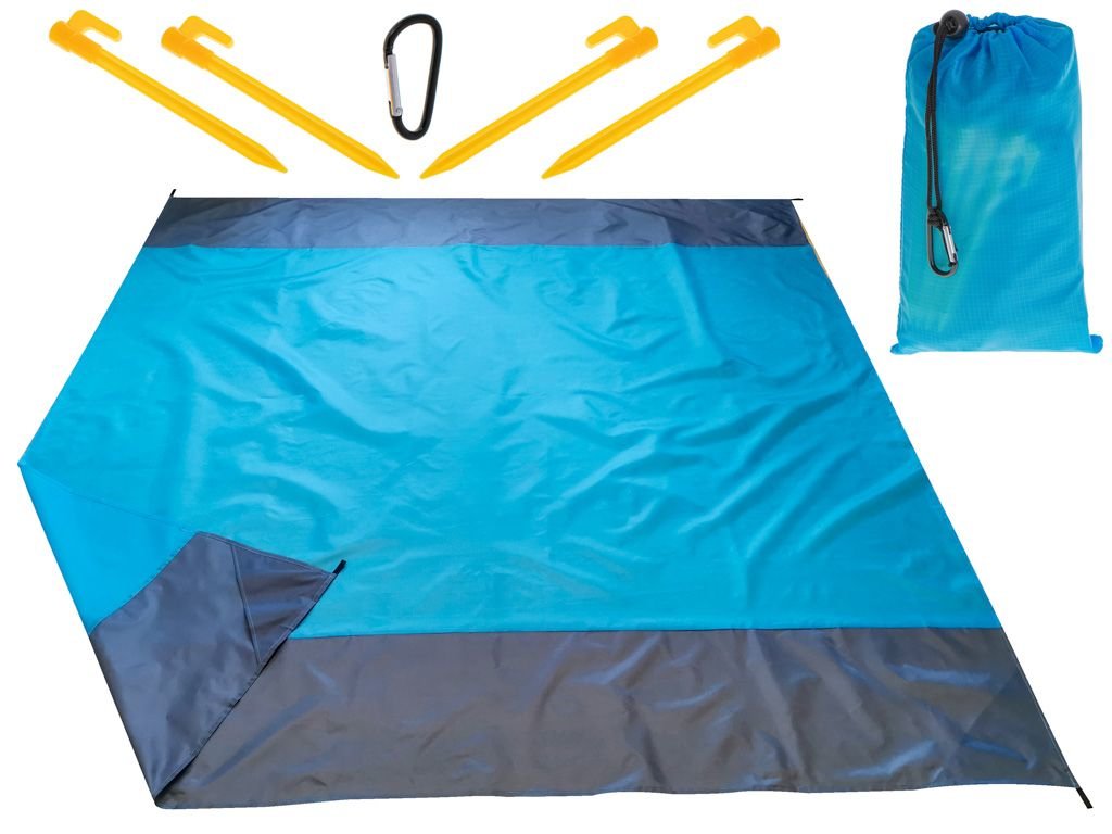 Dzięki temu kocowi kempingowemu/plażowemu możesz cieszyć się miłymi chwilami w gronie najbliższych. Niezależnie od tego, czy przygotowujesz piknik w miejskim parku, czy wybierasz się nad jezioro lub do lasu, z tym kocem nie będziesz musiał dźwigać nieporęcznych, dużych koców piknikowych, które zajmują niemal całe miejsce w plecaku. Wykonany z mocnego, wytrzymałego i oddychającego nylonu, przetrwa lata użytkowania. Miękka tkanina przyjazna dla skóry ułatwia otrząsanie piasku, a woda z kostiumu wysycha już po kilku minutach. W wietrzne dni mata plażowa lub ogrodowa może być zabezpieczona za pomocą kołków, które są częścią zestawu.