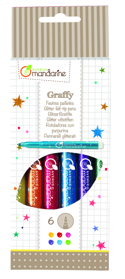 Ten zestaw flamastrów to idealne wyposażenie do szkoły, na wycieczki i do domowego tworzenia. Koloruj kolorowanki, twórz napisy, ozdabiaj kartki z życzeniami lub dodawaj blasku gdzie tylko chcesz. Brokatowe flamastry marki Avenue Mandarine to gwarancja jakości i zabawy dla małych i większych artystów.