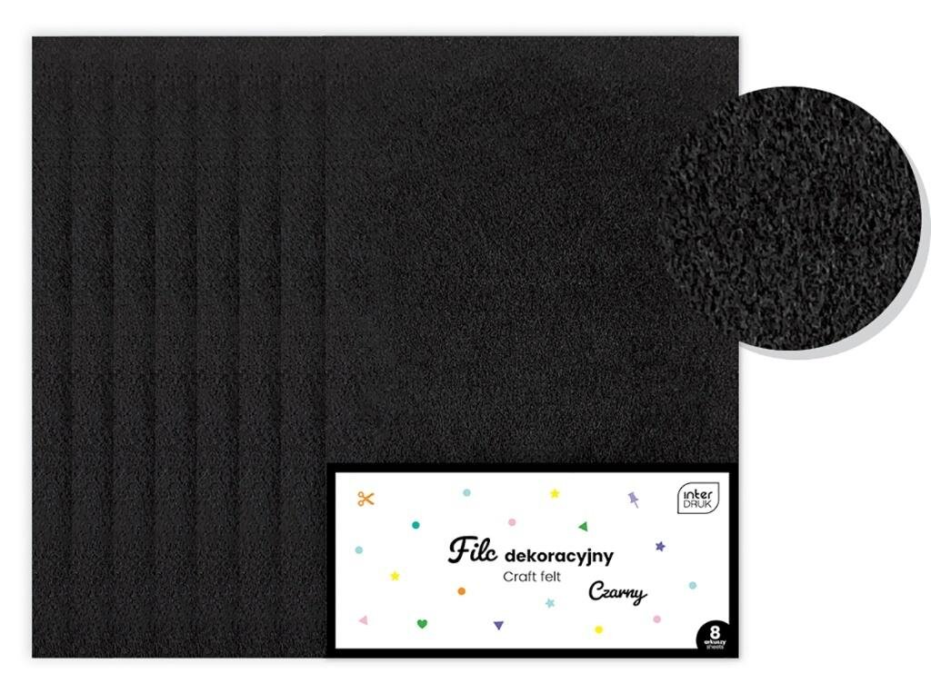 Filc czarnyIdealny do szycia ozdób, maskotek, poduszek.Do kreatywnego wykorzystania w scrapbookingu.Opakowanie zawiera 8 arkuszy filców w rozmiarze A4 w czarnym kolorze. przeczytaj całość