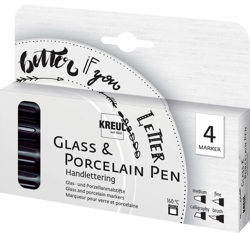Kulatą 2-4 mm Skośną 1-2 mm. Kaligraficzną pędzelkową. Ściętą kaligraficzną 1-4 mm Farba na bazie wody. Do szkła, szkliwionej ceramiki, metalu i porcelany. Po wypaleniu można myć w zmywarce. Marker można łączyć ze wszystkimi kolorami i markerami z serii KREUL do porcelany i szkła, które są na bazie wody. Przed użyciem odtłuść, oczyść i sprawdź odporność na temperaturę dekorowanego przedmiotu. Marker z końcówką pędzelkową nie wymaga wstrząsania ani pompowania, można od razu pisać lub malować. Pozostałe markery trzeba wstrząsnąć i napompować. Nie wysycha przez 4 godziny, następnie wypiekaj w piekarniku w 160° C w nieprzedgrzanym piekarniku przez 90 minut