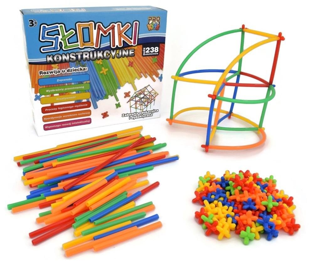 Zestaw SŁOMKI KONSTUKCYJNE składa się z 238 elementów. Możemy konstruować każdą budowlę jaką tylko dziecko sobie wymyśli. Innowacyjny system szybkiego łączenia elementów powoduje że dziecko szybko i chętnie rozwija swoje kreatywne umiejętności. Wspaniała zabawa dla jednej osoby jak i całej...