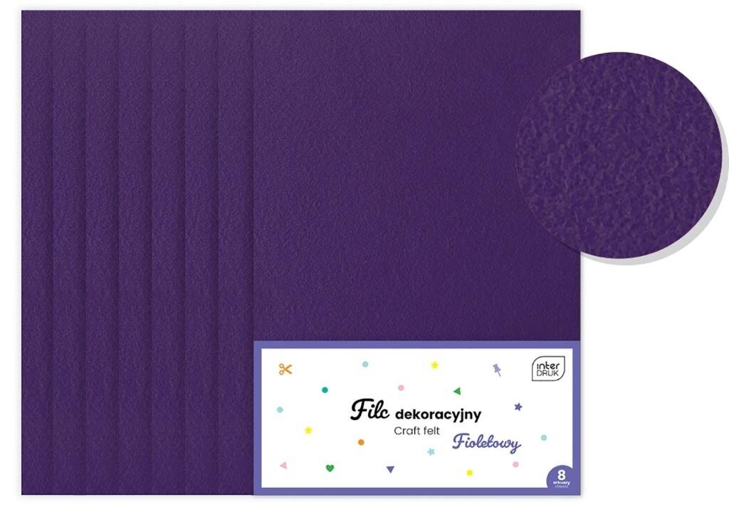 Idealny do szycia ozdób, maskotek, poduszek. Do kreatywnego wykorzystania w scrapbookingu. Opakowanie zawiera 8 arkuszy filców w rozmiarze A4 w fioletowym kolorze. przeczytaj całość