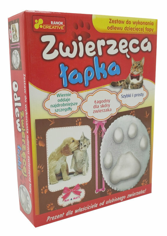 Zwierzęca łapkaOdlew zwierzęcej łapki to zestaw, który stanowi wspaniały prezent dla właściciela każdego pupila. Uzupełnij swoją kolekcję zdjęć zwierzaka o odcisk jego łapki. Taka pamiątka sprawi wiele radości każdemu właścicielowi i może być świetną dekoracją domu.Zestaw zawiera: żel do odlewów, proszek gipsowy, kartkę ze wstążkami,plastikową formę, instrukcję.Wymiary opakowania: 22,5 x 17 x 5 cmWiek: 5+