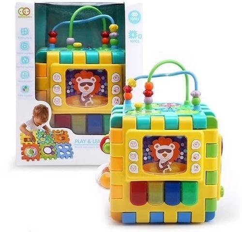 Kostka edukacyjna Funkcje: dźwięki, światło, ruchome elementy, labirynt z koralikami, odgłosy zwierząt, możliwość rozłożenia kostki, bezpieczne lusterko, sorter, zegar, pianinko, melodie przeczytaj całość