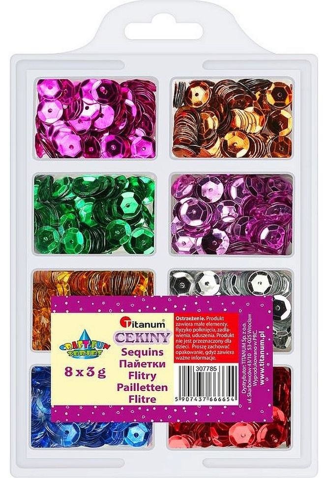 Cekiny okrągłe. Metaliczne, średnica: 7 mm. Opakowanie: 8 kolorów x 3g. przeczytaj całość